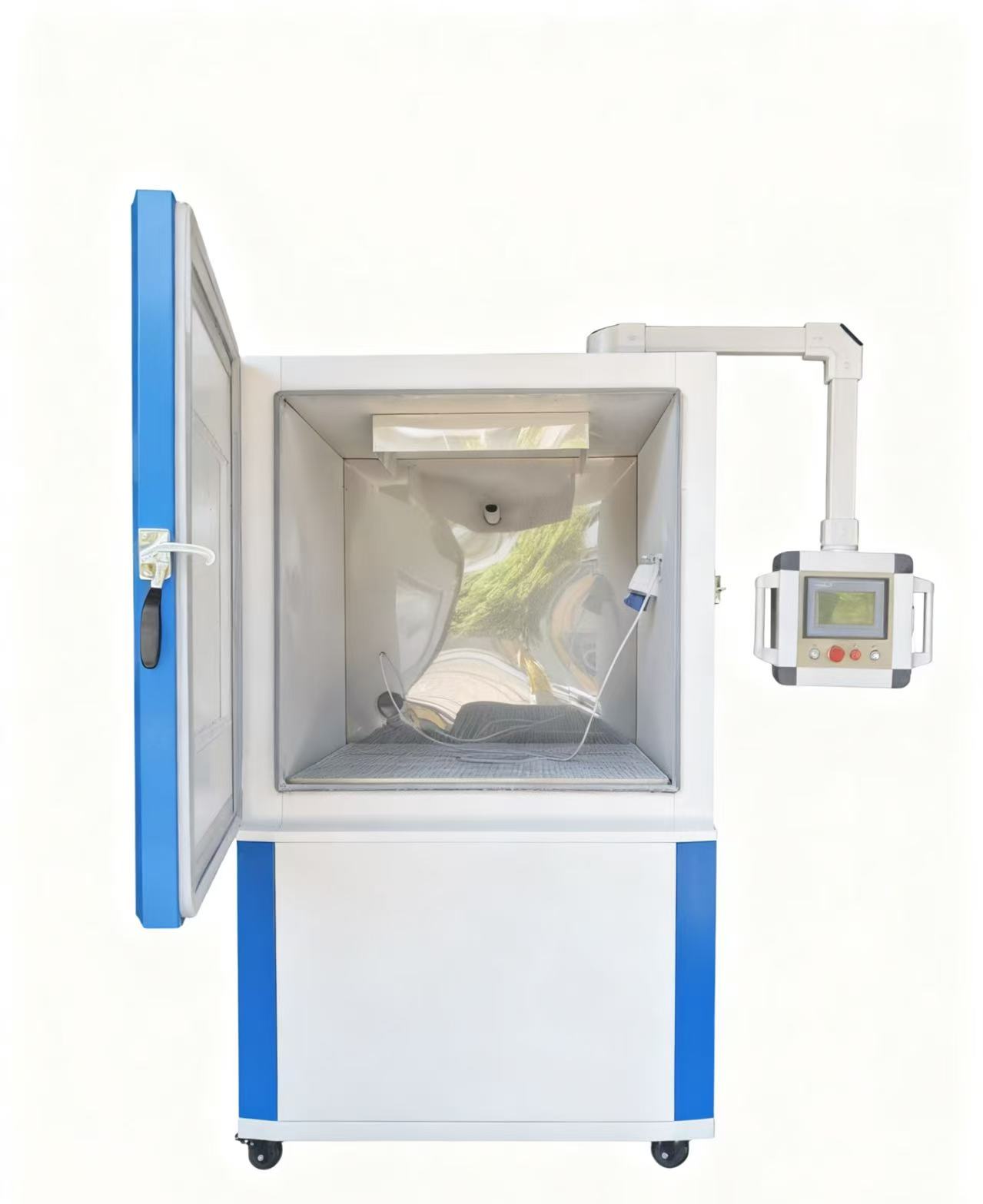 該設(shè)備外殼采用冷軋鋼板靜電噴塑,內(nèi)膽為優(yōu)質(zhì)不銹鋼板,外型整體美觀大方。箱門(mén)中間設(shè)有大面積觀察窗加手動(dòng)雨刮裝置,可以方便在試驗(yàn)過(guò)程中清晰地看到